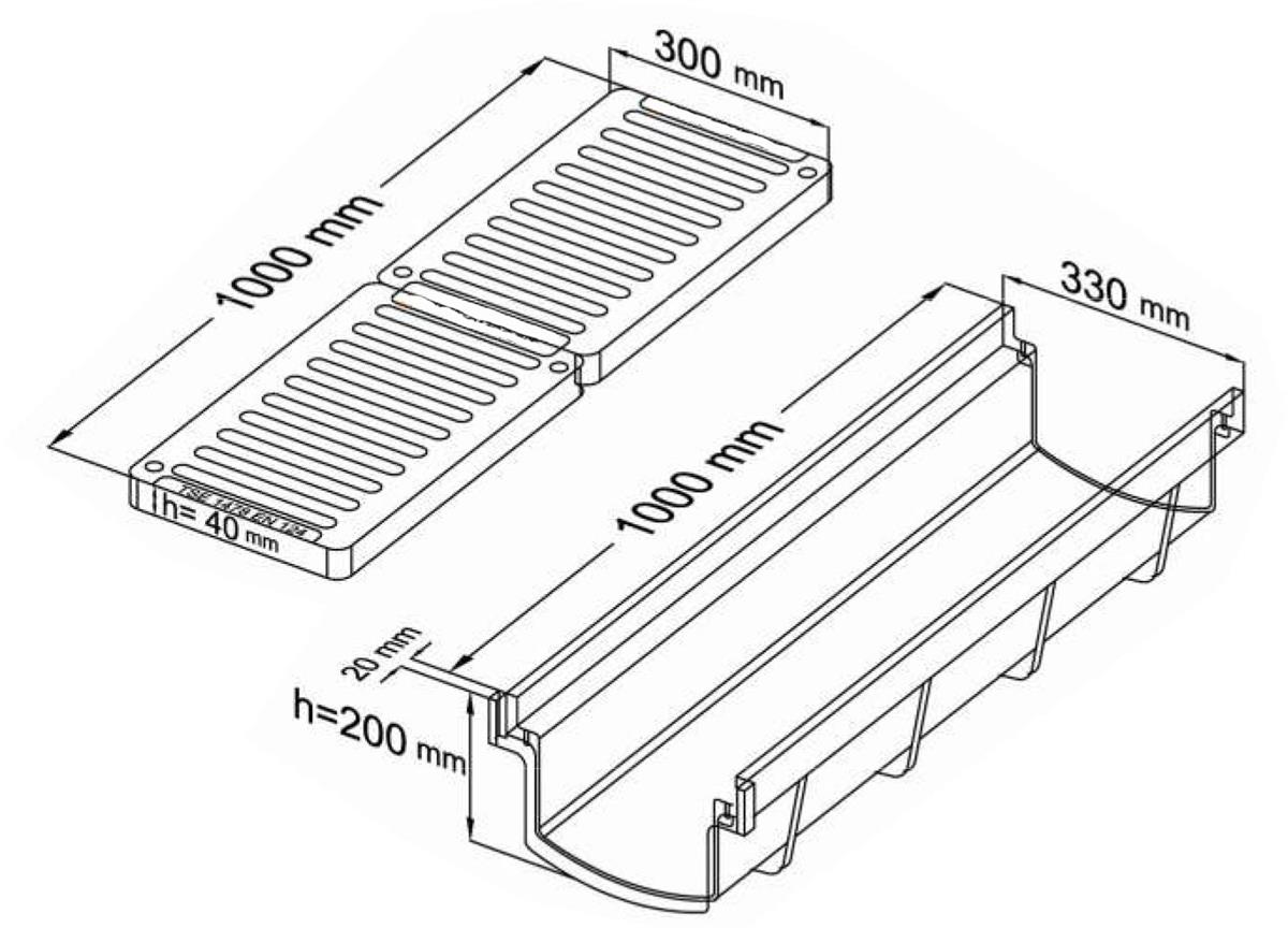 Kanal ve ızgarasının eni 300 mm, boyu 1000 mm ve yüksekliği 200 mm ölçülmüştür.
