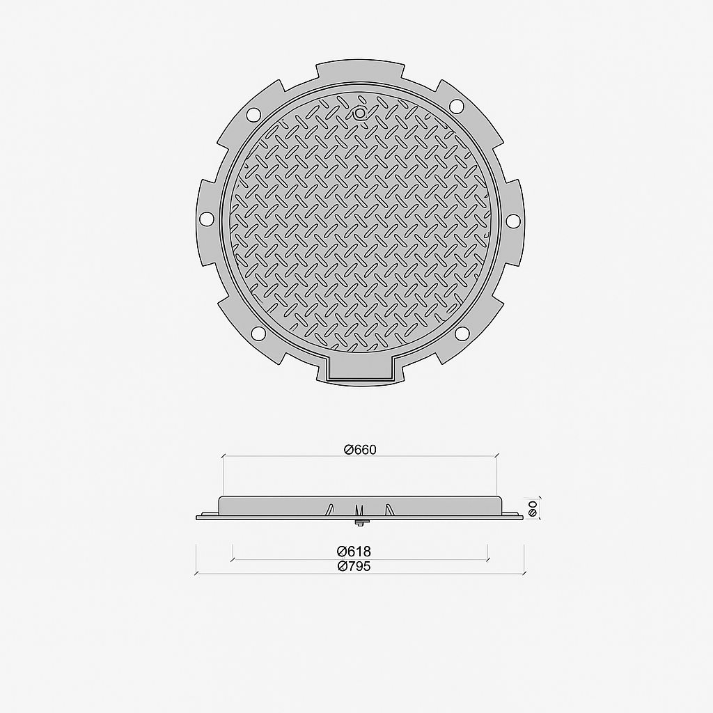 Ayrıca döküm rögar kapağı c yük sınıfı deliksiz tip model ürününün şekli dairedir ve manuel kilitli özelliklere sahiptir. Menteşeli olmakla birlikte conta sistemine sahiptir. Conta sistemi sıvı akışını durdurur. Kapağın eni 795 mm, boyu ise 660 mm’dir. Ayrıca yükseklik 60 mm’dir. Ağırlık kaldırma kapasitesi yani yük sınıfı C250 (25 ton)’dur. Yaklaşık ağırlık ise 55 kilo civarıdır.