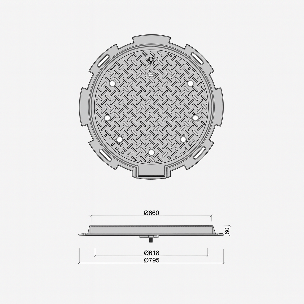 Kendisine özgü bir tasarımı olup üst kısmında yağmur suyu için belli aralıkla konulan delikler bulunur. Yük sınıfı C250 olup, döküm malzemeden yapılır. Manuel kilitli ve menteşelidir. Ortalama olarak ağırlığı 55 kg olup, yüksekliği ise 6 cm ve eni 79.5 cm, boyu 66 cm değerindedir. Dairesel bir formu vardır. Uzun süre dayanım gösterir.